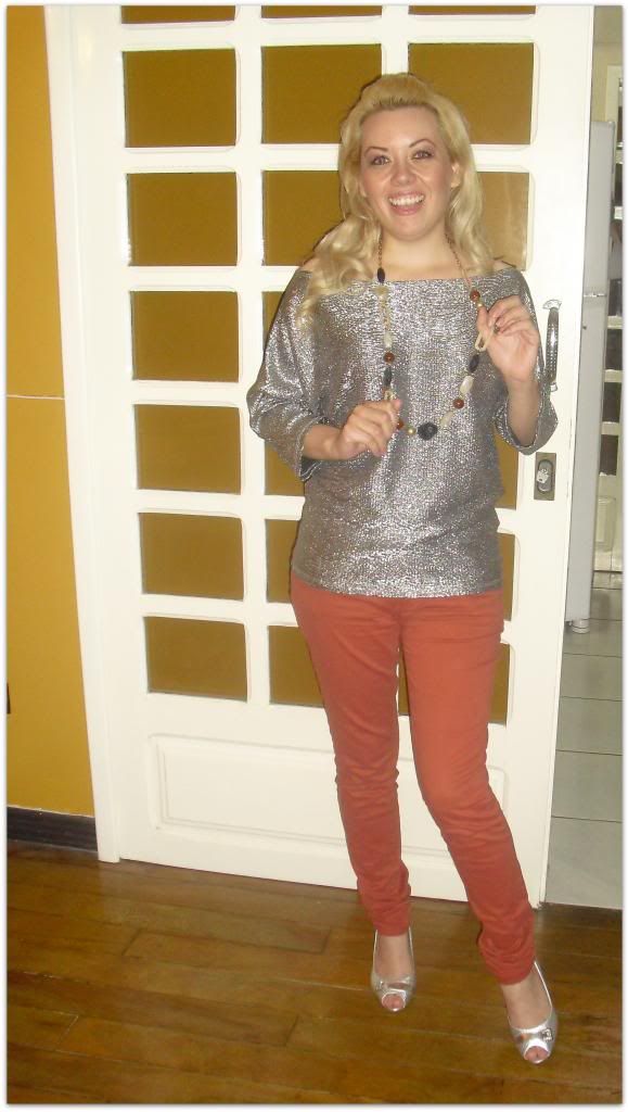 O colar de pedras e madeira em tons terra, que combinam com a calça, é da minha mana e peguei na cara-de-pau.  A calça, muito linda, estou in love, é Blue Style, laranja bem verão,  combina com o sapato peeptoe prateado (super confortável) harmoniza com a blusa prata.